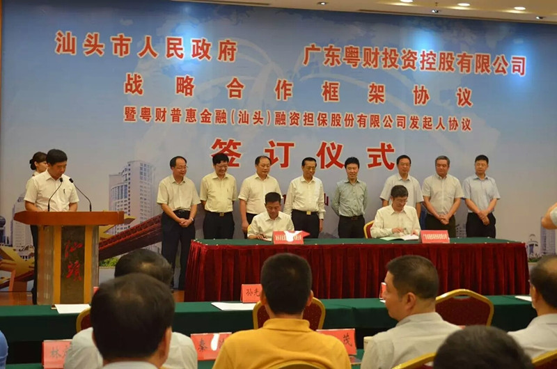 為建立健全汕頭市政策性擔保機構,緩解中小微企業融資難、融資貴問題,昨日下午,在汕頭市政府和汕頭市財政局的大力支持下,汕頭市金源資產經營有限公司(下稱金源公司)與廣東省融資再擔保有限公司(下稱省再擔保公司),于汕頭市委機關大院就共同出資設立粵財普惠金融(汕頭)融資擔保股份有限公司 達成協議,金源公司主要負責人詹東與省再擔保公司法人代表劉祖前簽訂了粵財普惠金融(汕頭)融資擔保項目發起人協議。