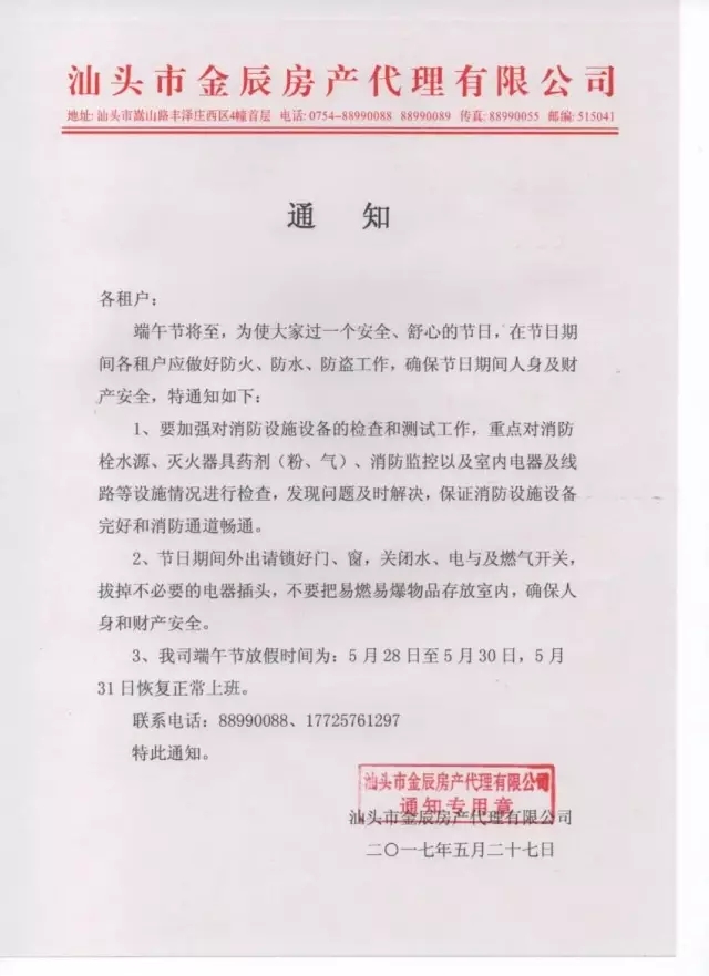 【金辰公告】2017年端午節(jié)安全通知