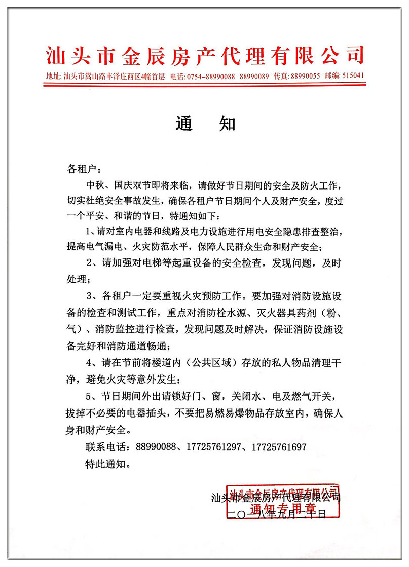 【金辰公告】2018年中秋、國慶雙節安全通知